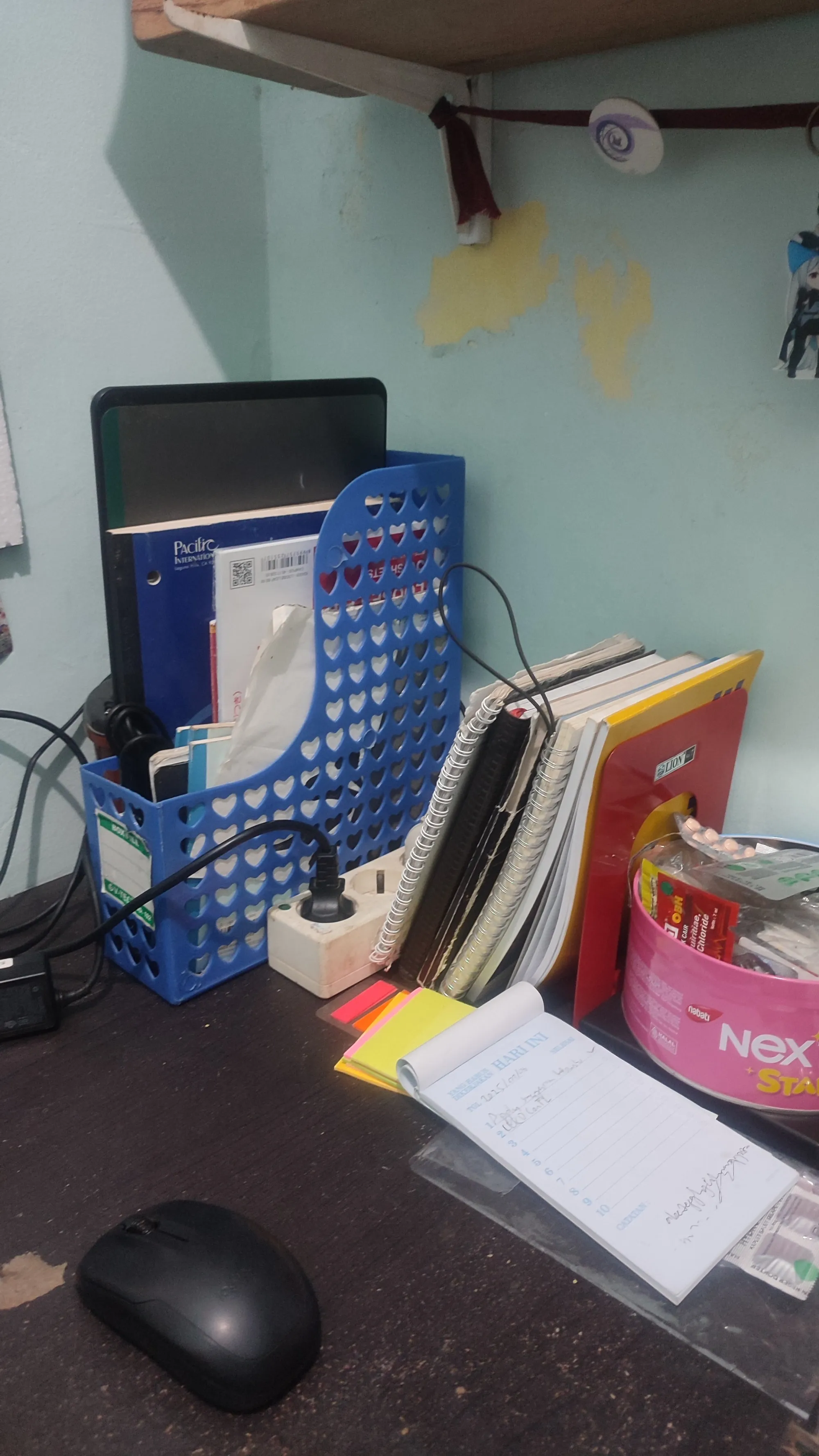 Penataan pojok meja yang terisi buku catatan, pen tablet, kotak obat, sticky notes, stop kontak, dan kabel-kabel.